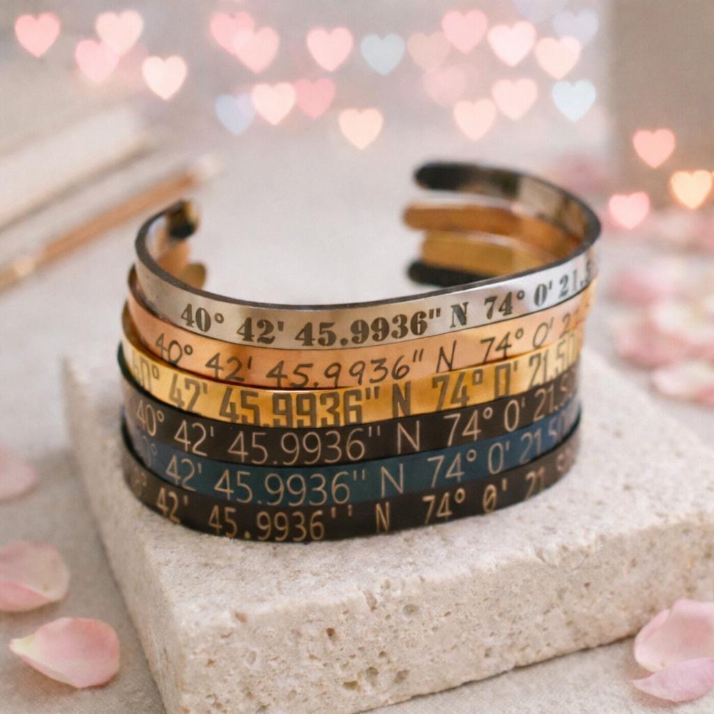 Personalized Engrave Bracelet Cuff with Co-ordinates . Makes a Custom Gift for Friend, Parents, Siblings, Birthdays, Weddings, Anniversaries, New Year, Christmas, Fathers Day, Mothers Day and any occasion.