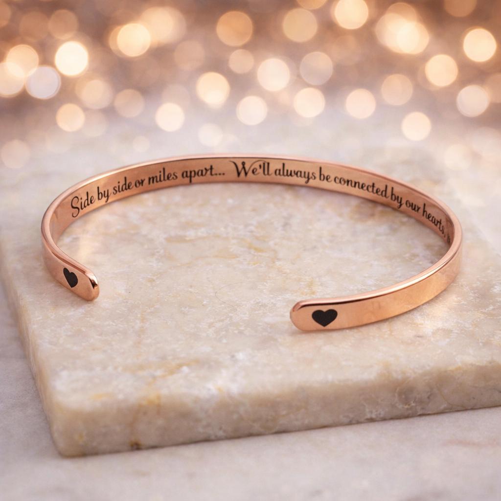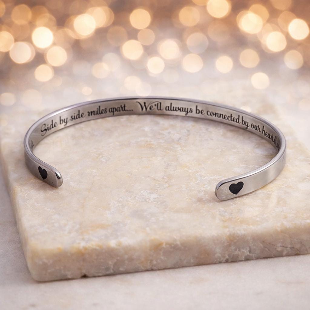 Side by Side or miles apart, will always be connected by heart Cuff Bracelet Bangles