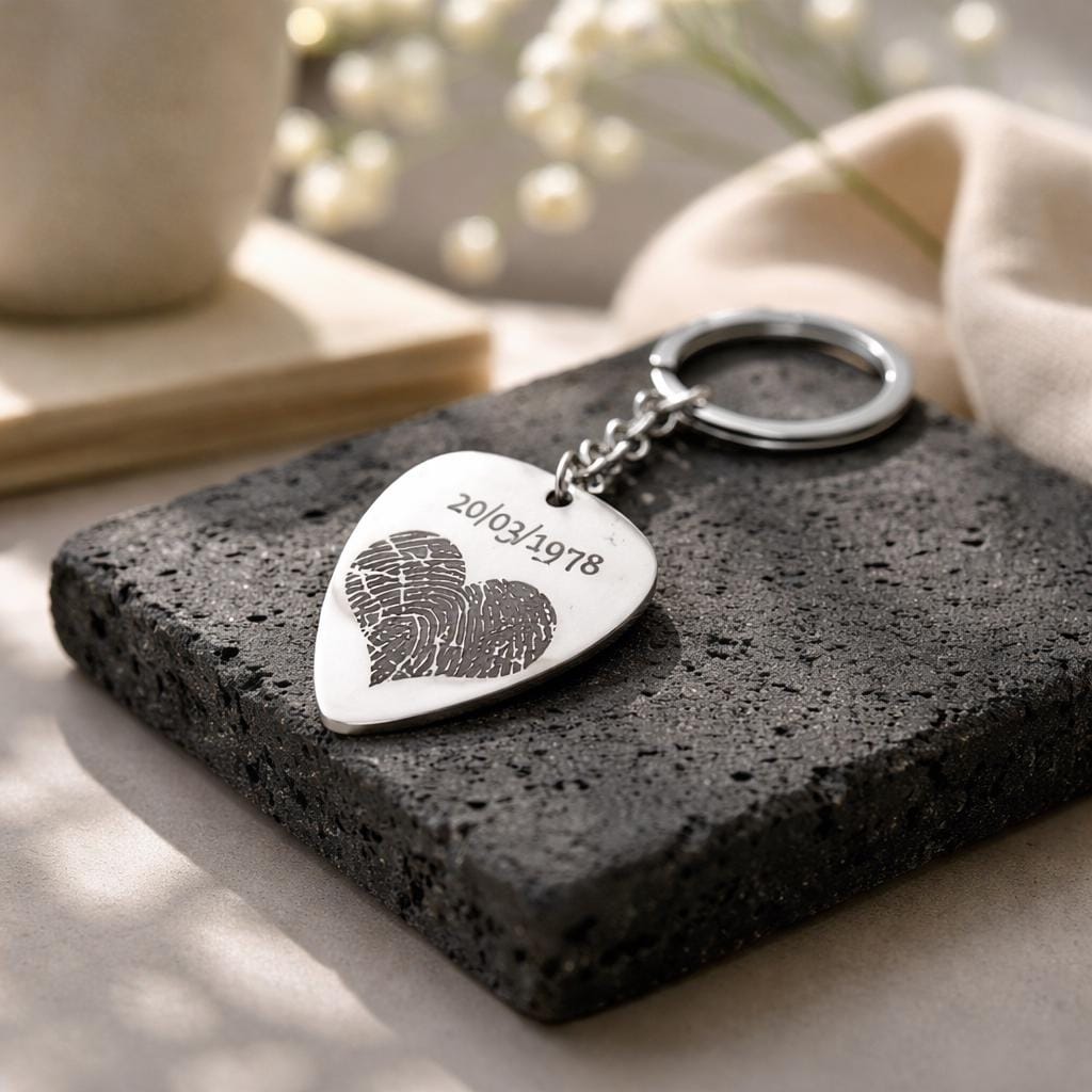 Make a memory last by customizing it with your loved ones fingerprint / thumb print on Guitar Pick. Keep that special one close to you at all times.