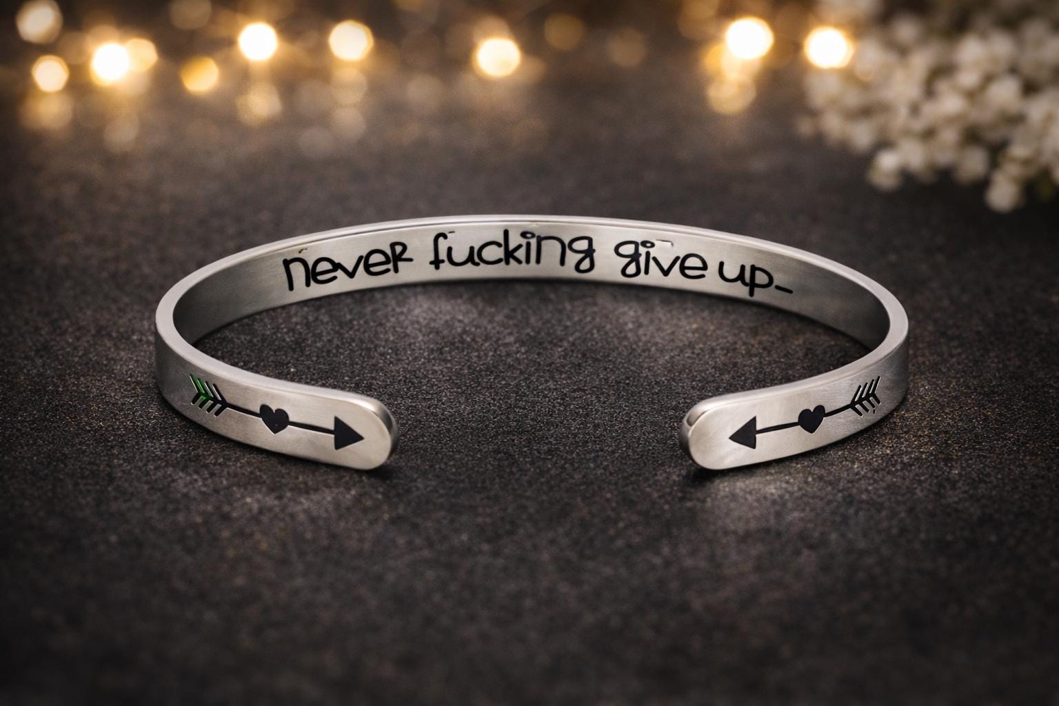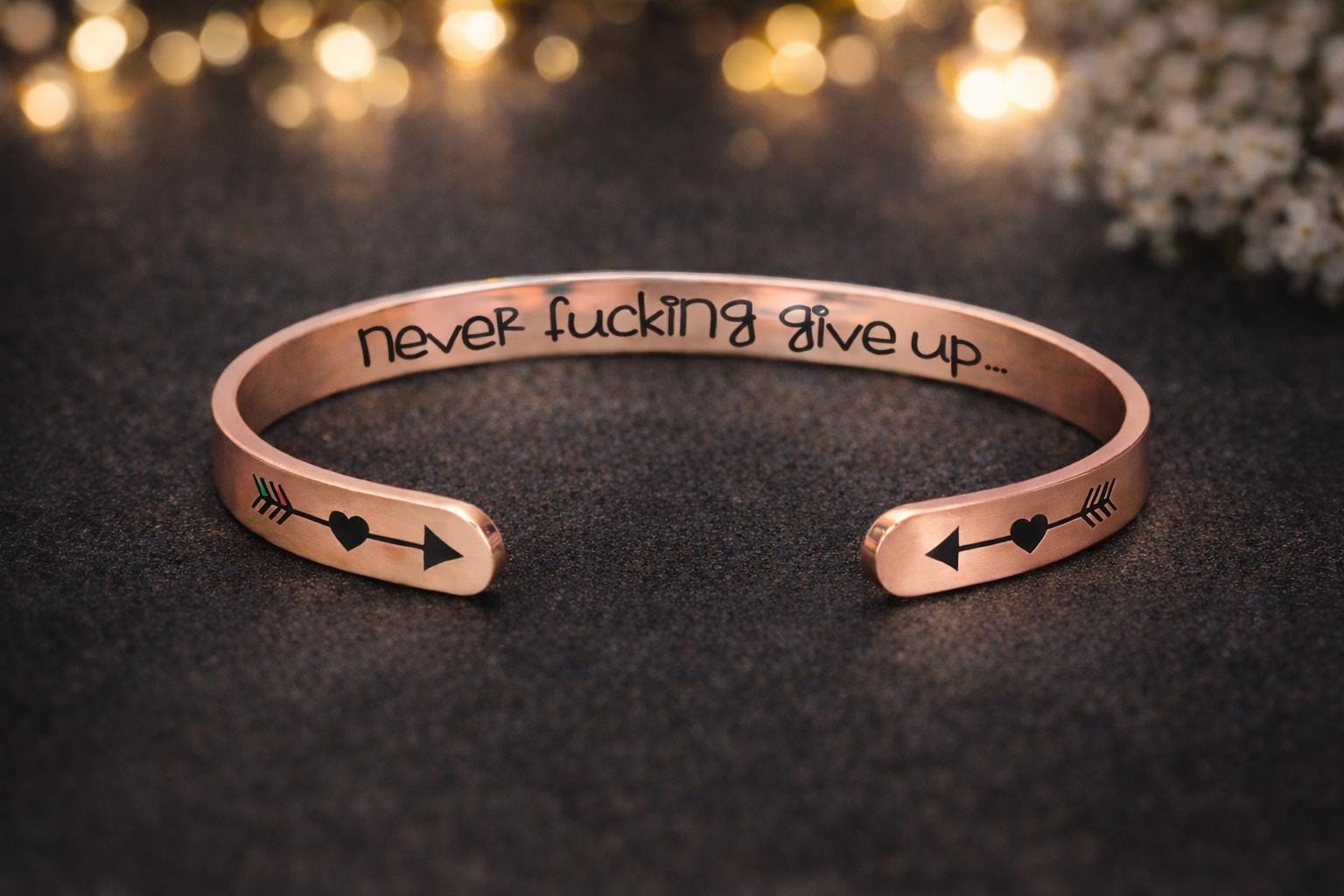 Never Fucking Give Up Inspirational Bracelet Cuff Bangle Mantra Quote Steel Motivational Friend Jewelry Gift for Women Teen Girls Sister.