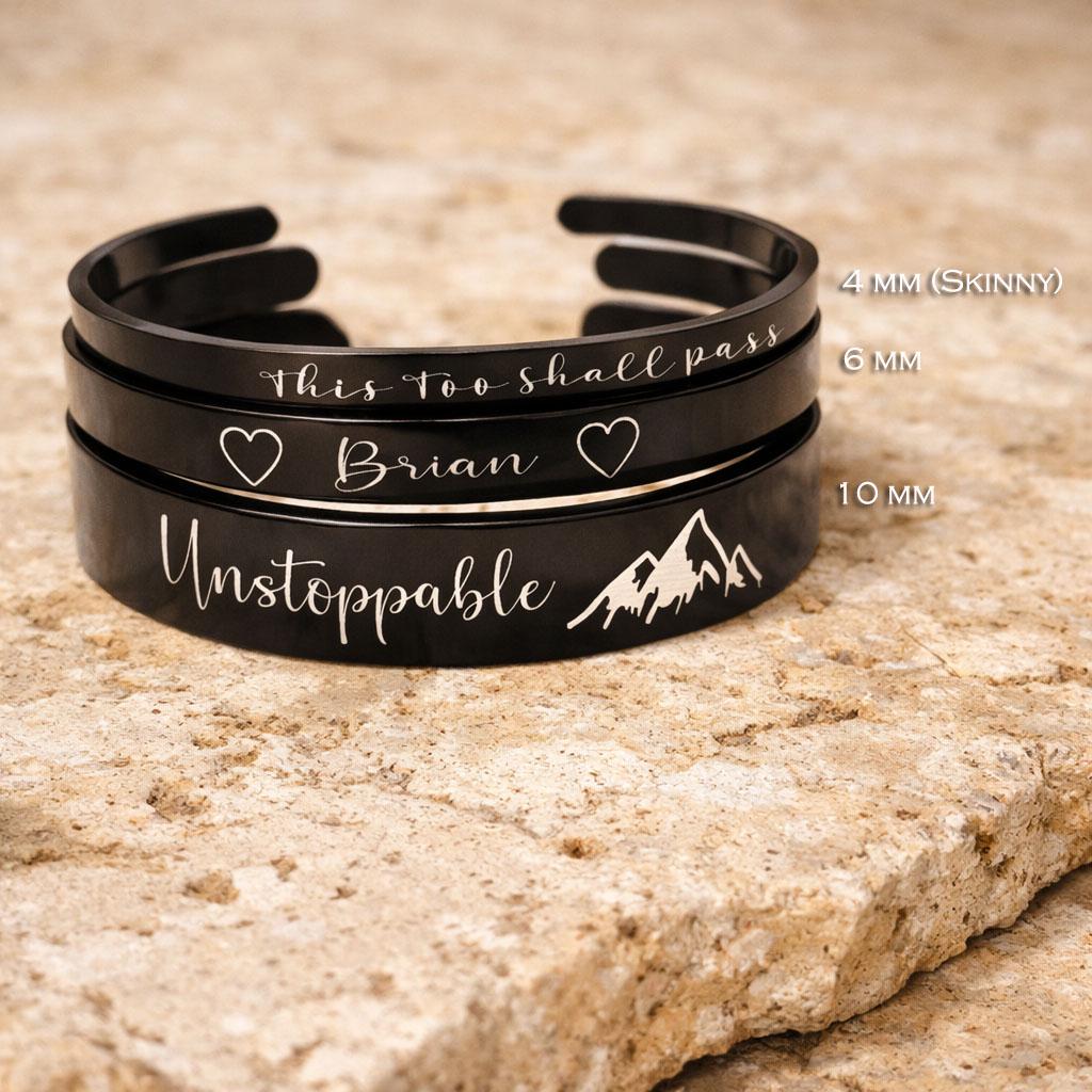 Personalize, and express your unique feelings on this Cuff Bracelet. Include your thoughts on this unique bracelet such as names, religious verses, GPS Coordinates, famous quotes, monograms and initials, memorable dates (birthdays or anniversary), memorable places, and zodiacs on this bracelet.