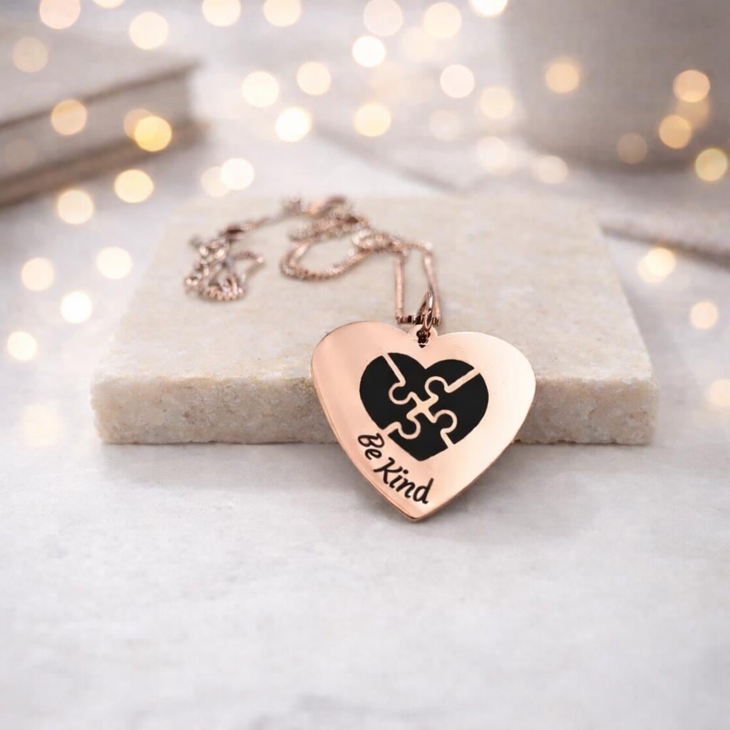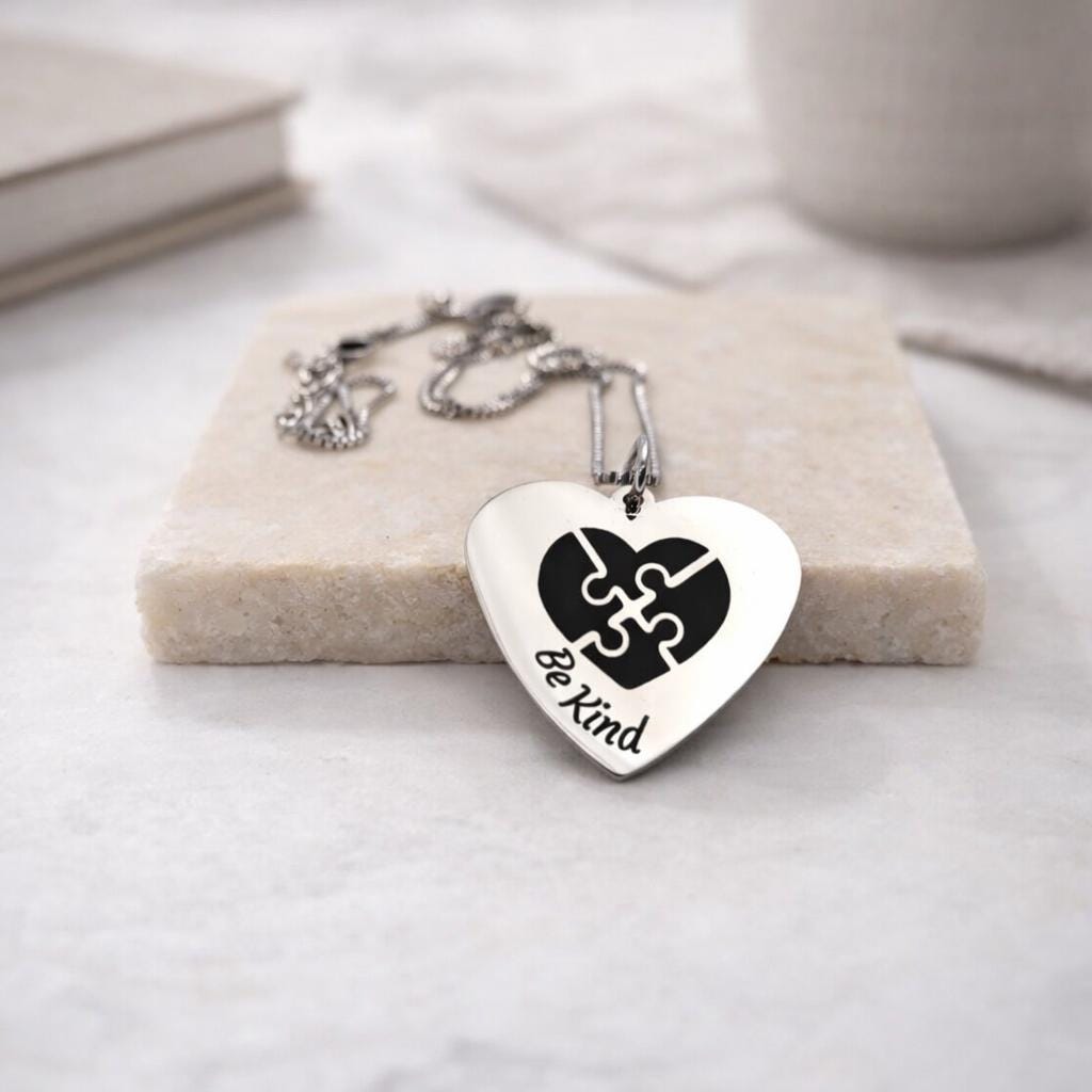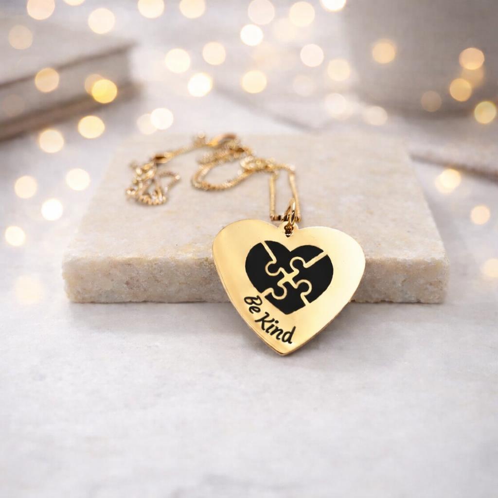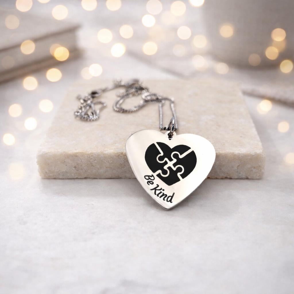 BE Kind with Puzzle Engraved Heart Pendant necklace Gift for men women boys girls.