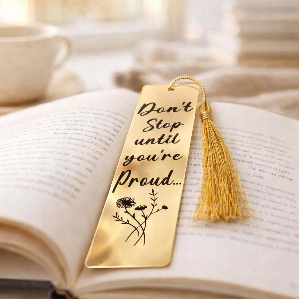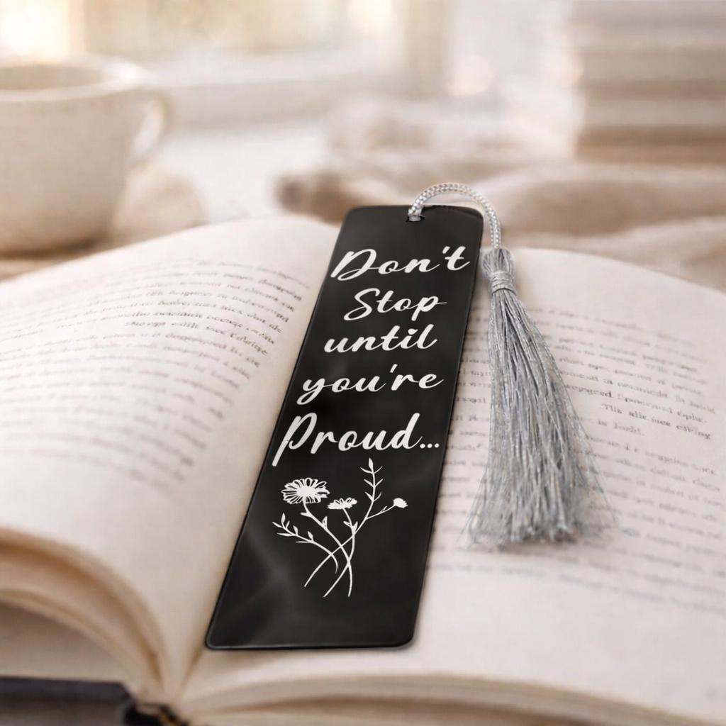 Don't Stop Until You're Proud. - Personalized Bookmarks Engraved with Tassel. Gift for Book Lovers Women Men Kids.