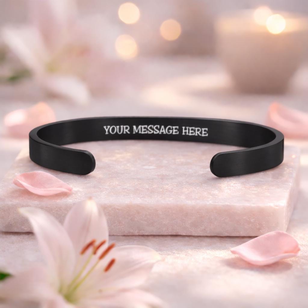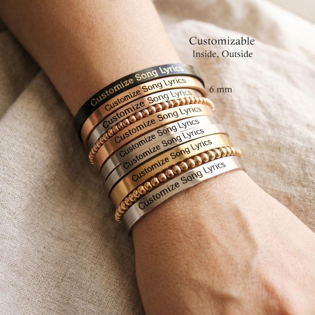 Personalize, and express your unique feelings on this Cuff Bracelet. Include your thoughts on this unique bracelet such as Song Lyrics, names, religious verses, GPS Coordinates, famous quotes, monograms and initials, memorable dates (birthdays or anniversary), memorable places, and zodiacs on this bracelet.