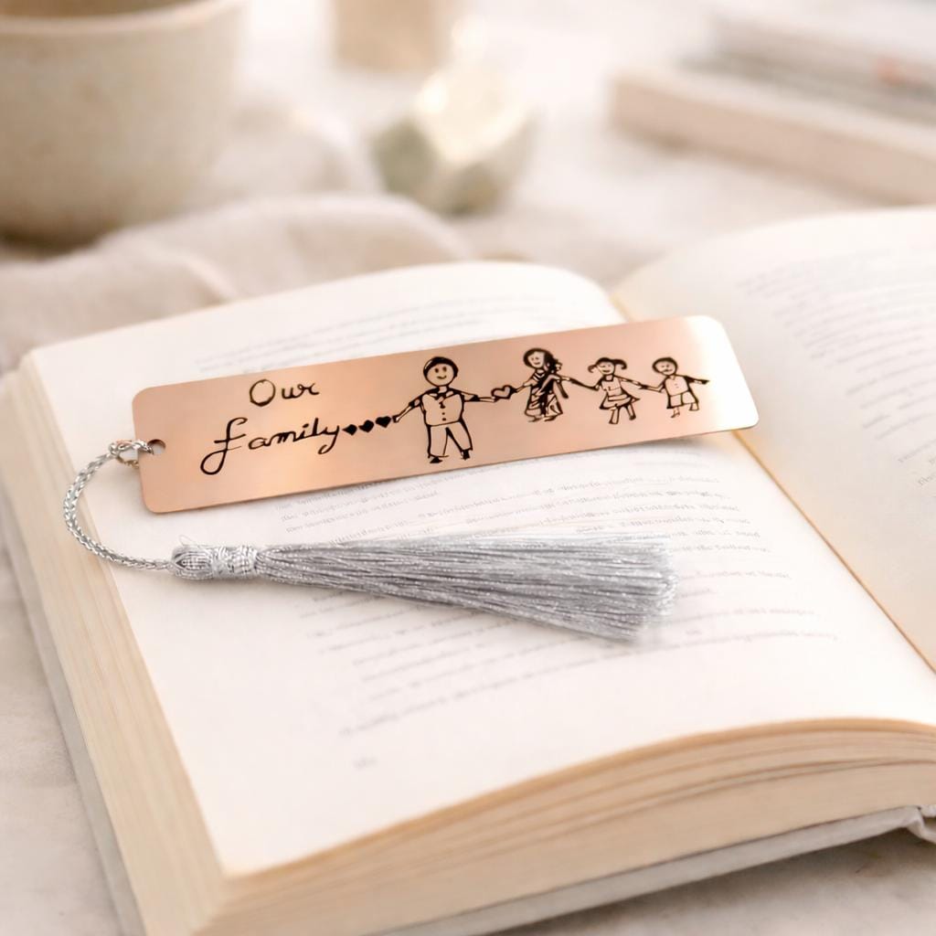 Can be engraved on Gold / Rose Gold / Steel Silver Color Metal Bookmarks. Send us a Jpg / Png File of your Childs / Kids Drawing or Handwriting and we will clean it and engrave it on the Bookmark.