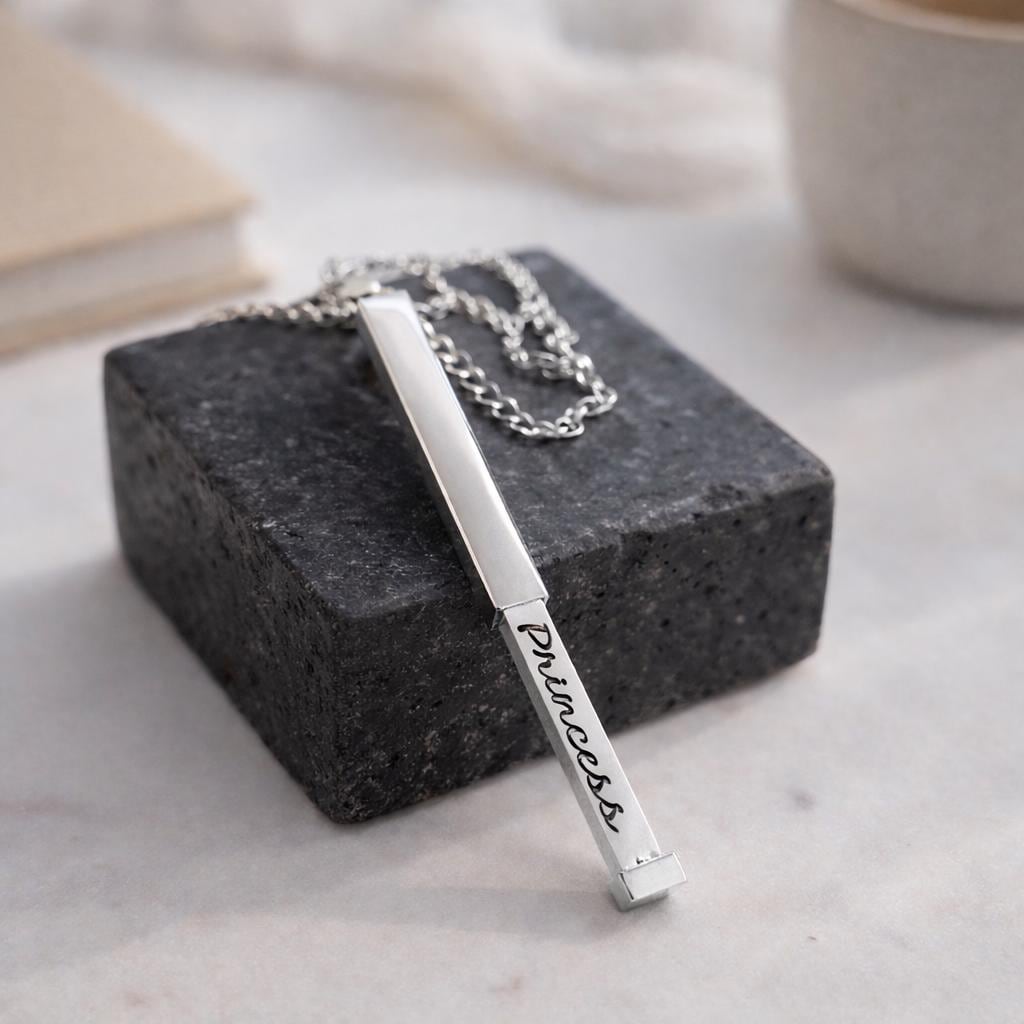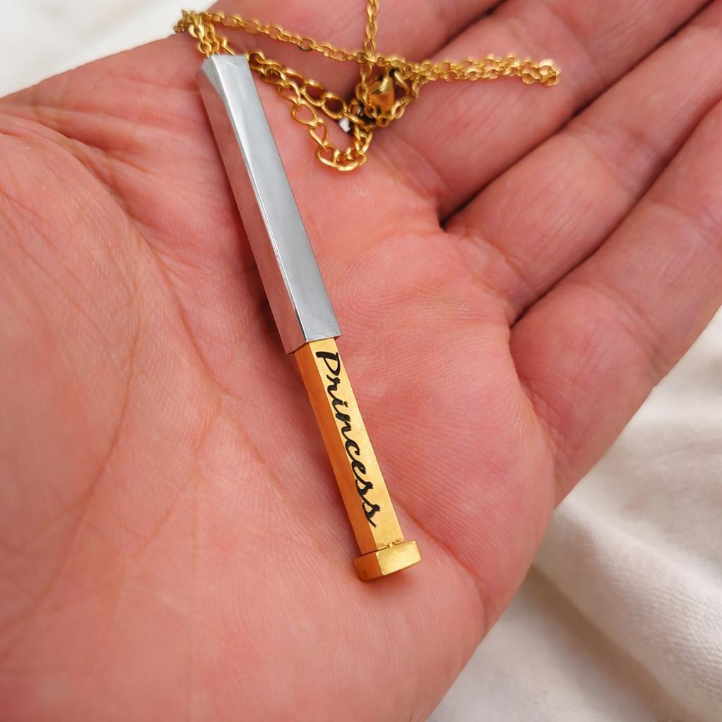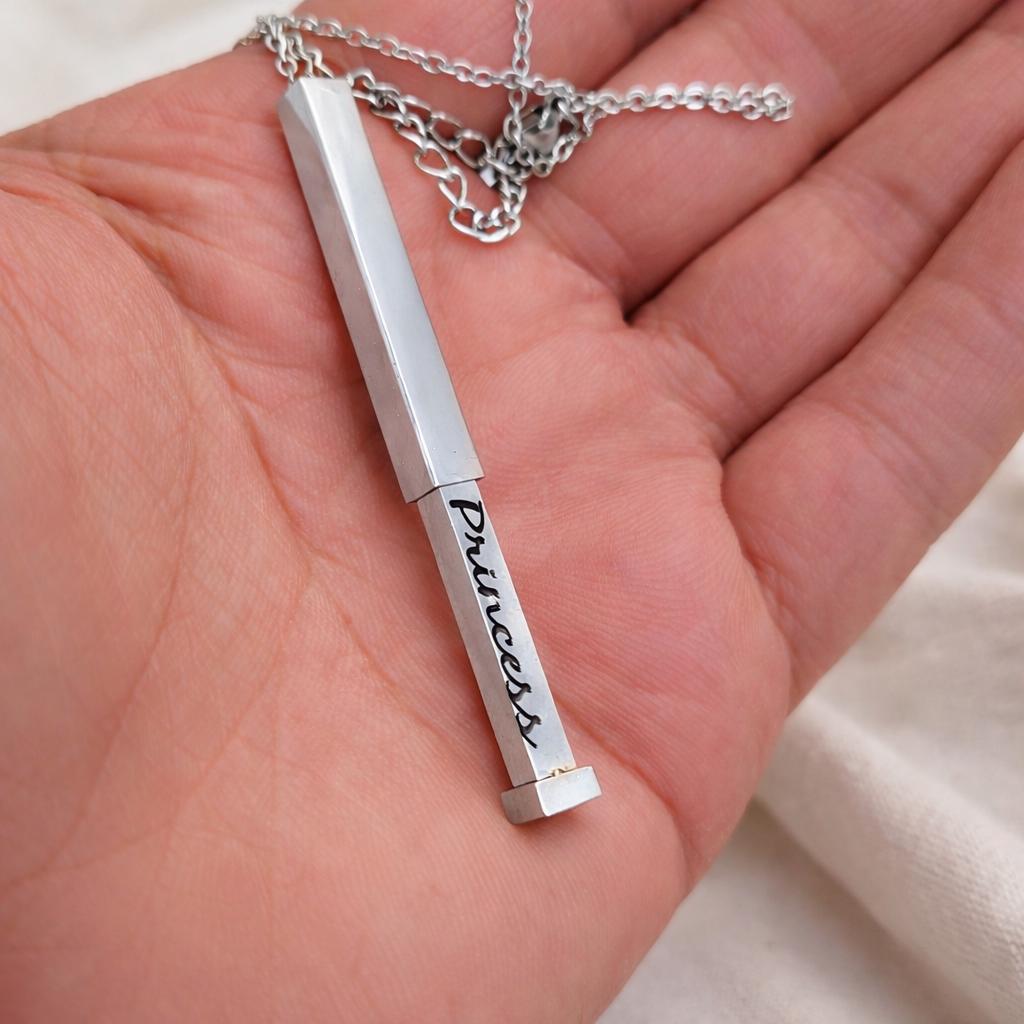 This beautiful necklace can be worn in public, with its "Princess" message discreetly hidden inside the pendant. Only you and your special someone will know the secret within. Perfect for work, public outings, or any occasion, this necklace lets you carry a private message close to your heart.
