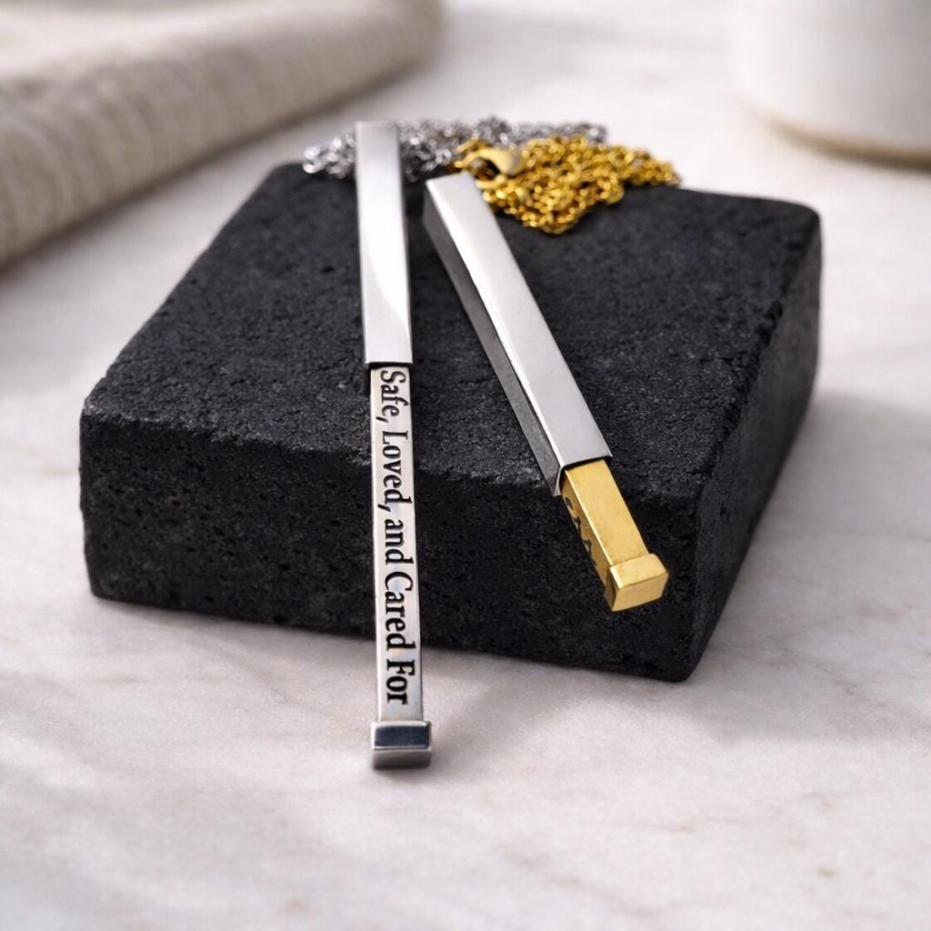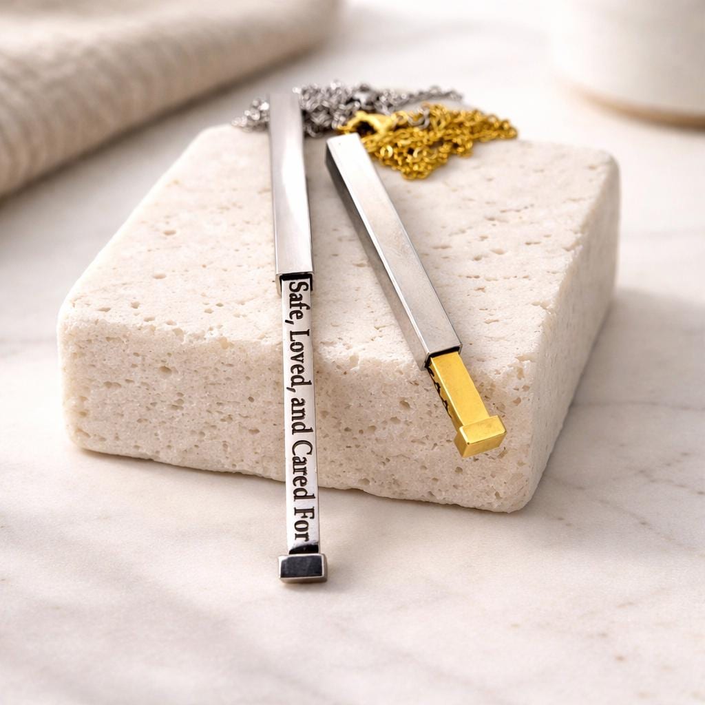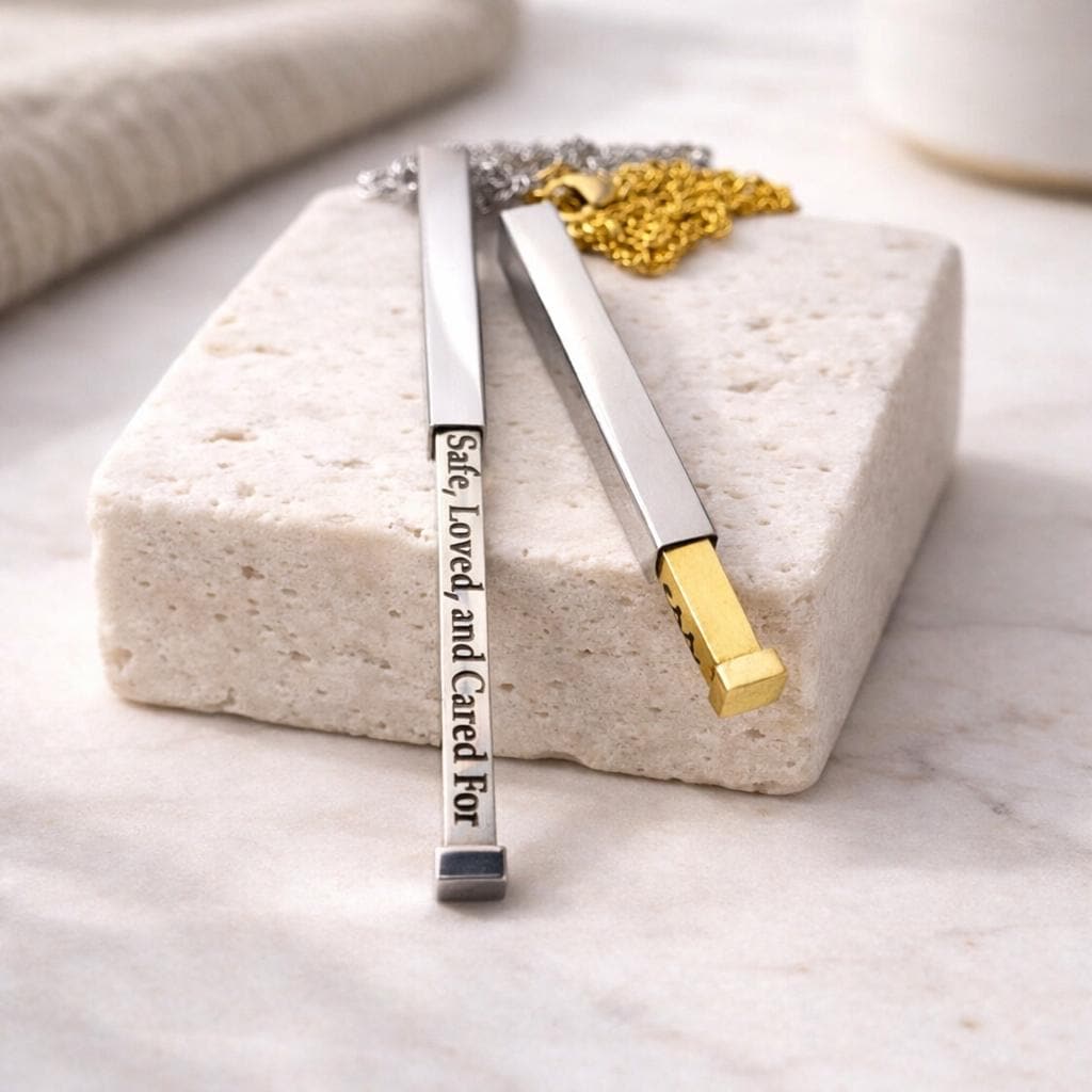This beautiful necklace can be worn in public, with its " Safe Loved and Cared for" message discreetly hidden inside the pendant. Only you and your special someone will know the secret within. Perfect for work, public outings, or any occasion, this necklace lets you carry a private message close to your heart.