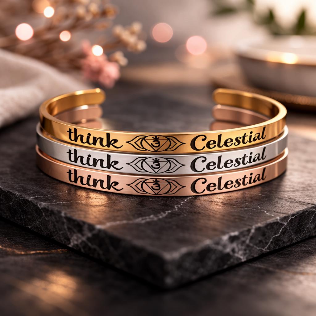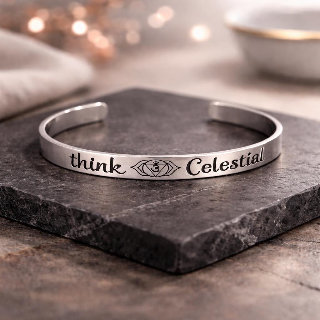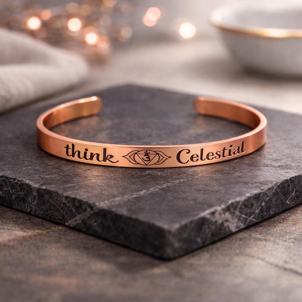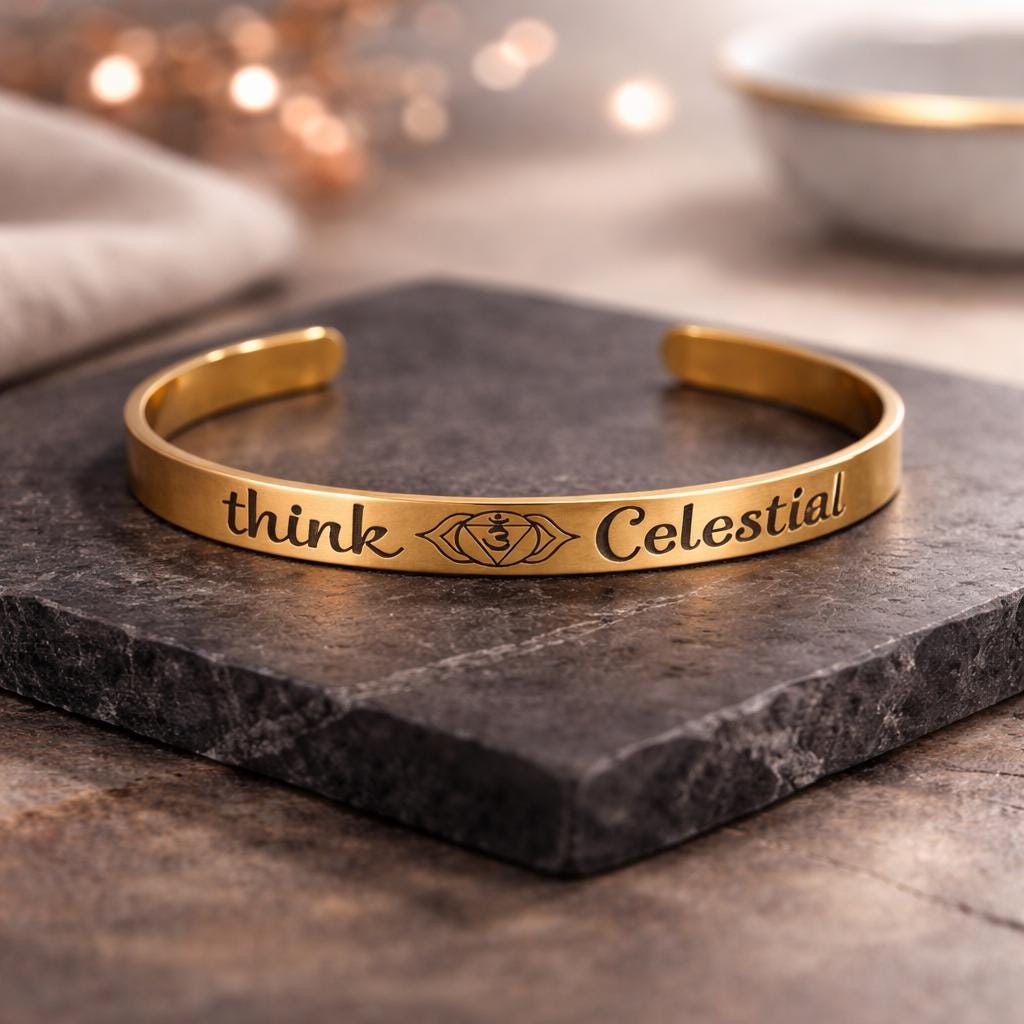 This Bracelet has the Message "Think Celestial" and Third eye in center engraved on the Outside of bracelet. The Corners are engraved with Sun.