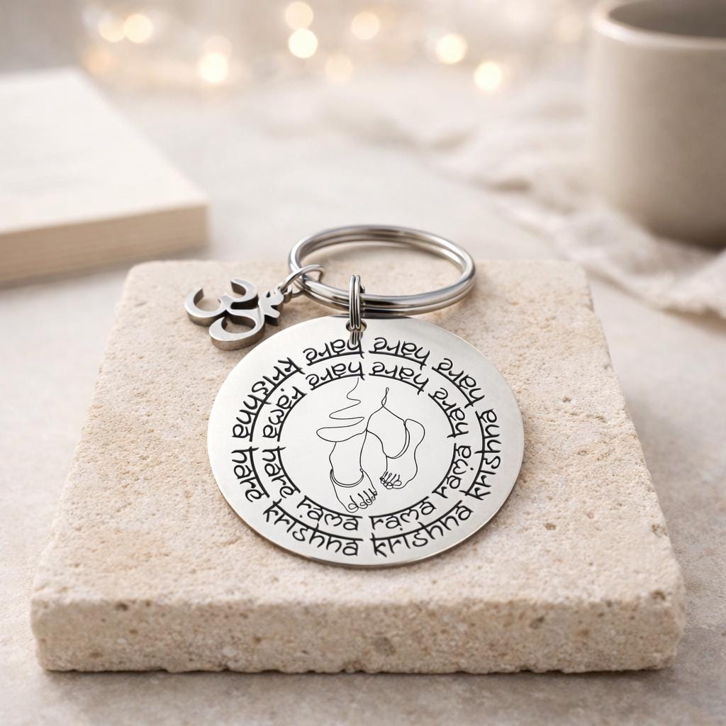 Hare Krishna Hare Rama Om Keychain. Unisex , Metal Round Keychain with Aum, Maha Mantra Hare Krishna.