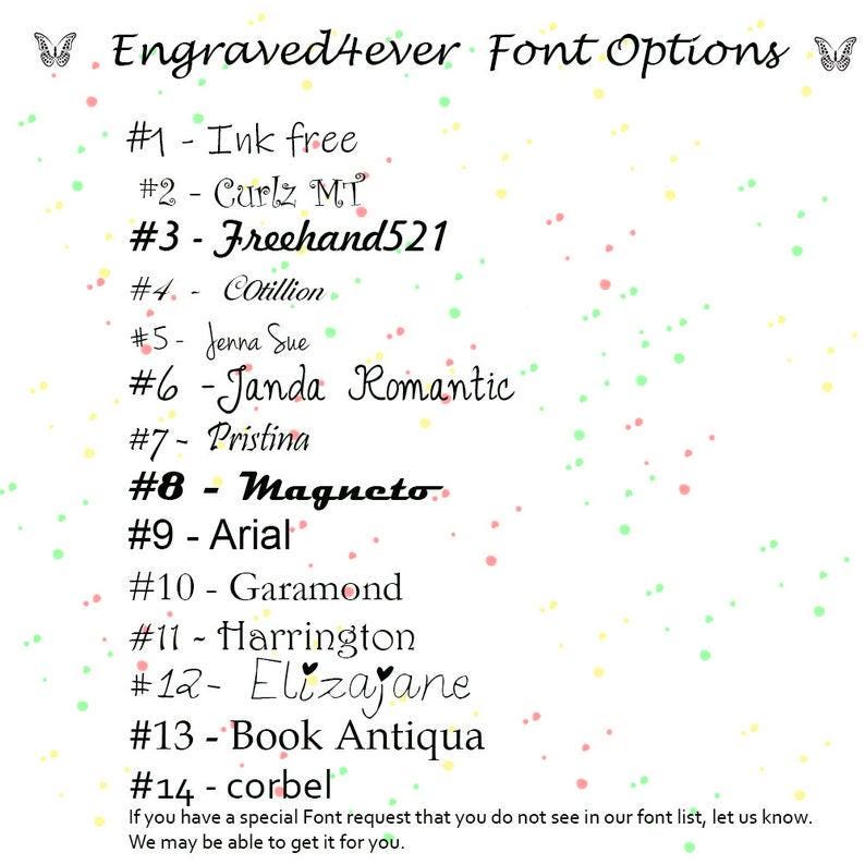 2) Use the 'Personalization Box' for ordering to let us know the Name / Initials and the FONT NUMBER you would like to use on each bar charm using this format: