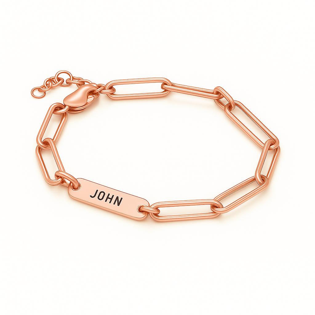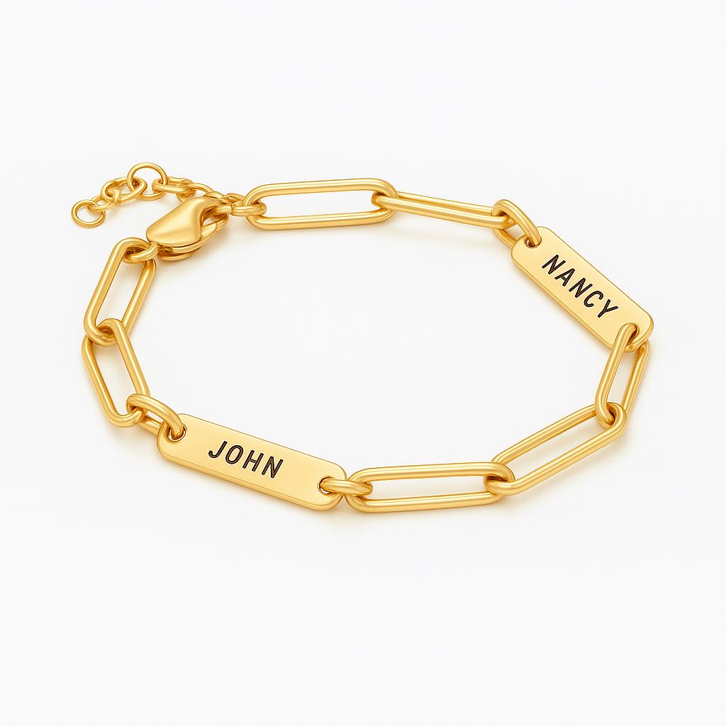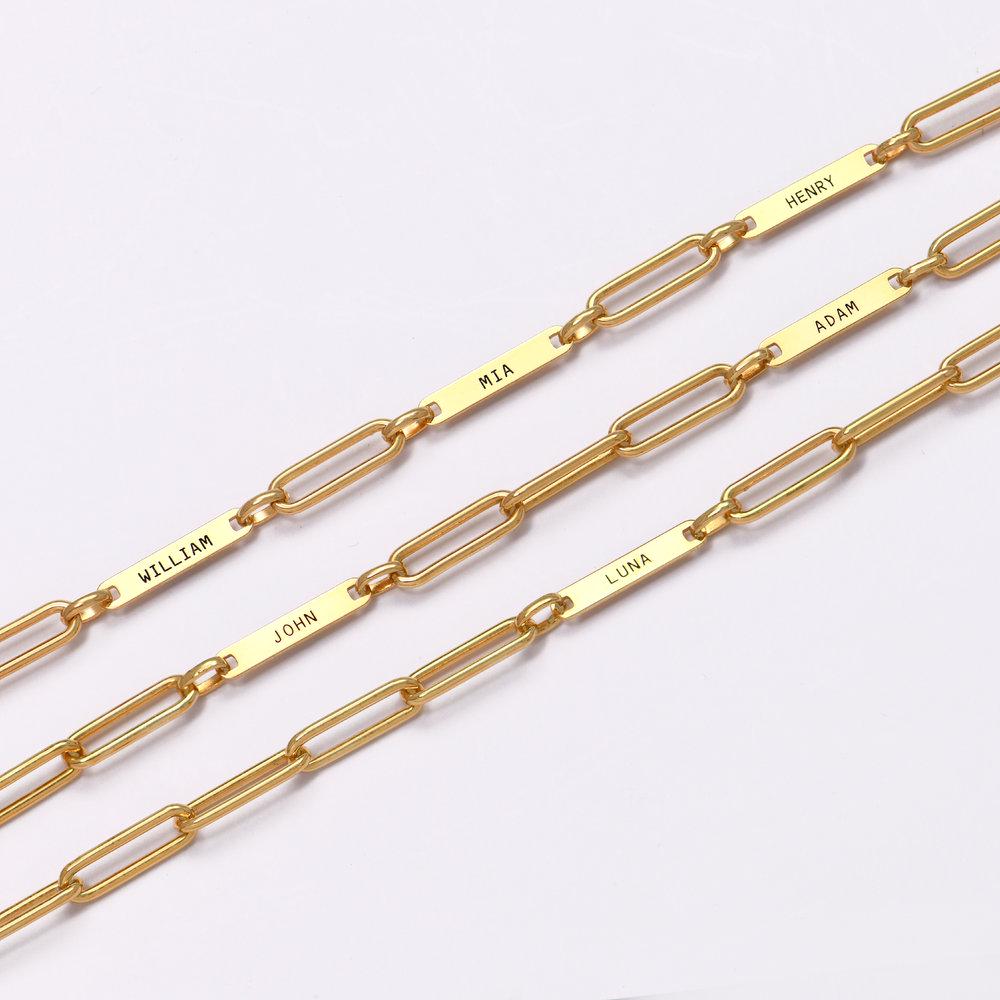 Customize this bar bracelet with names that hold special significance to you. The paperclip-style chain can also be adorned with multiple charms upto 3 charms , making it a thoughtful and personalized gift.