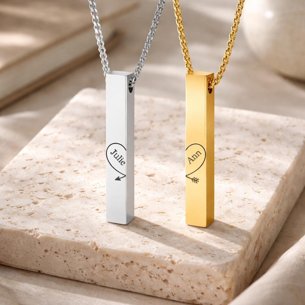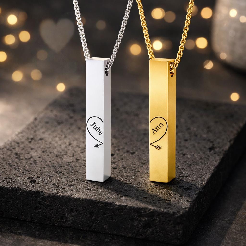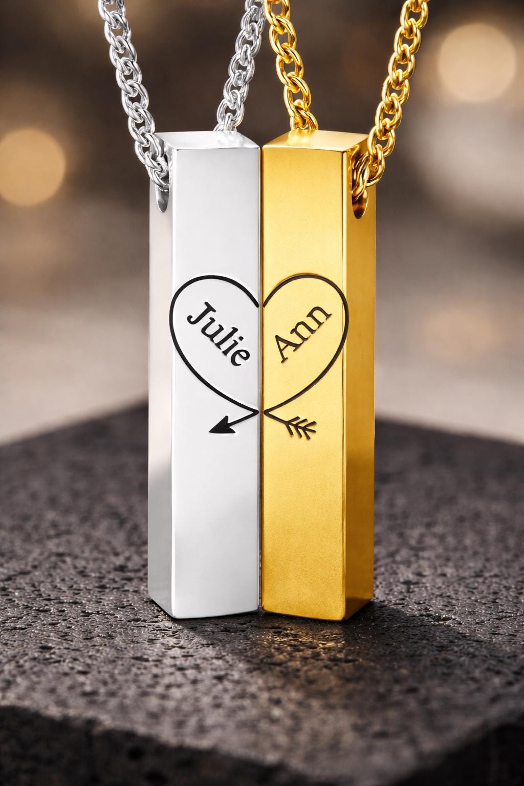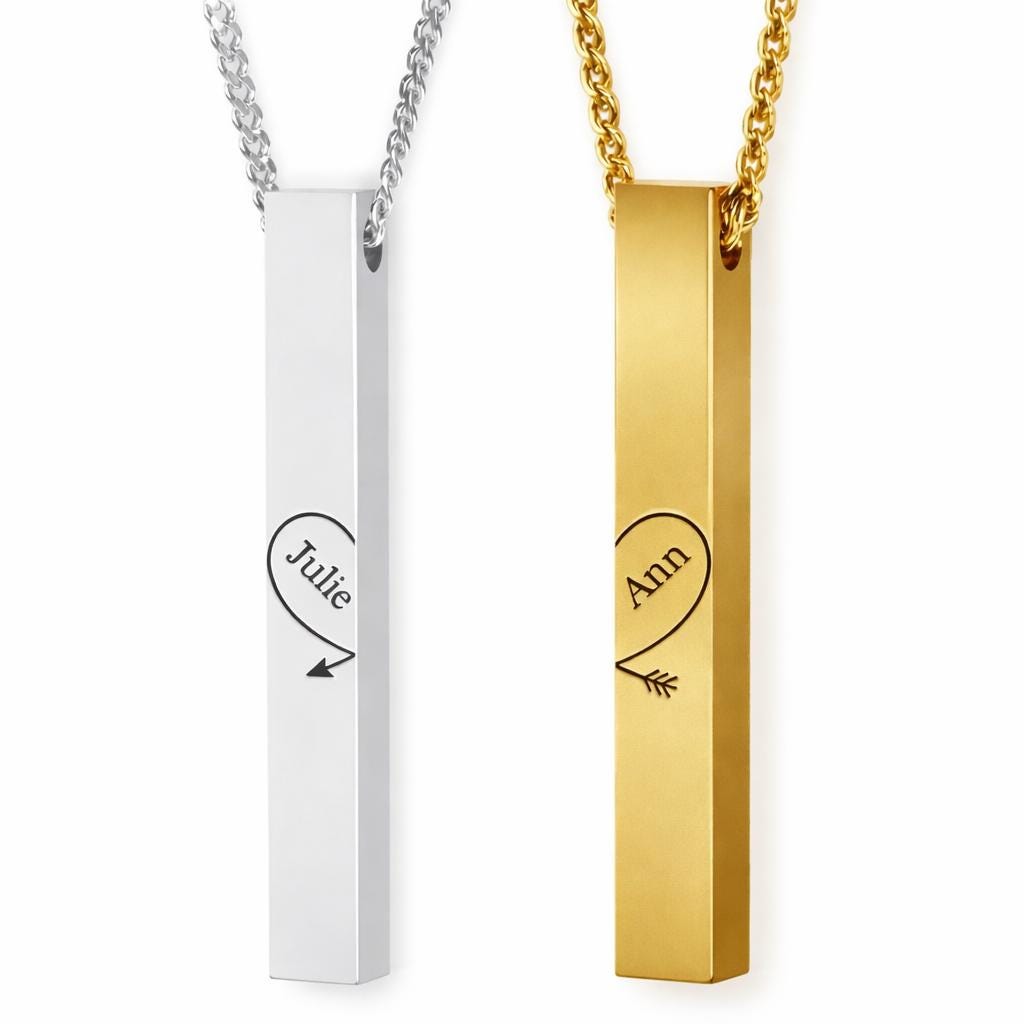 Celebrate your love story with this beautifully designed 2-piece engraved bar pendant set. When placed together, the two vertical bars form a complete heart with an arrow — symbolizing two souls perfectly connected.