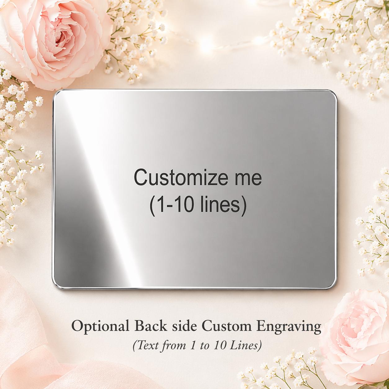 Engrave as many as 10 - 15 Lines of text with a Personalized message. We use Arial Font for custom back side engraving unless a different choice is specified. Upto 400 Characters text can be engraved on back.