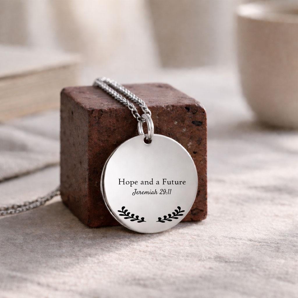 Carry a message of hope, faith, and new beginnings with our “Jeremiah 29:11 – Hope and a Future” necklace. Thoughtfully designed as a classic round pendant, this piece serves as a daily reminder that there is a beautiful plan ahead—full of purpose, promise, and possibility.