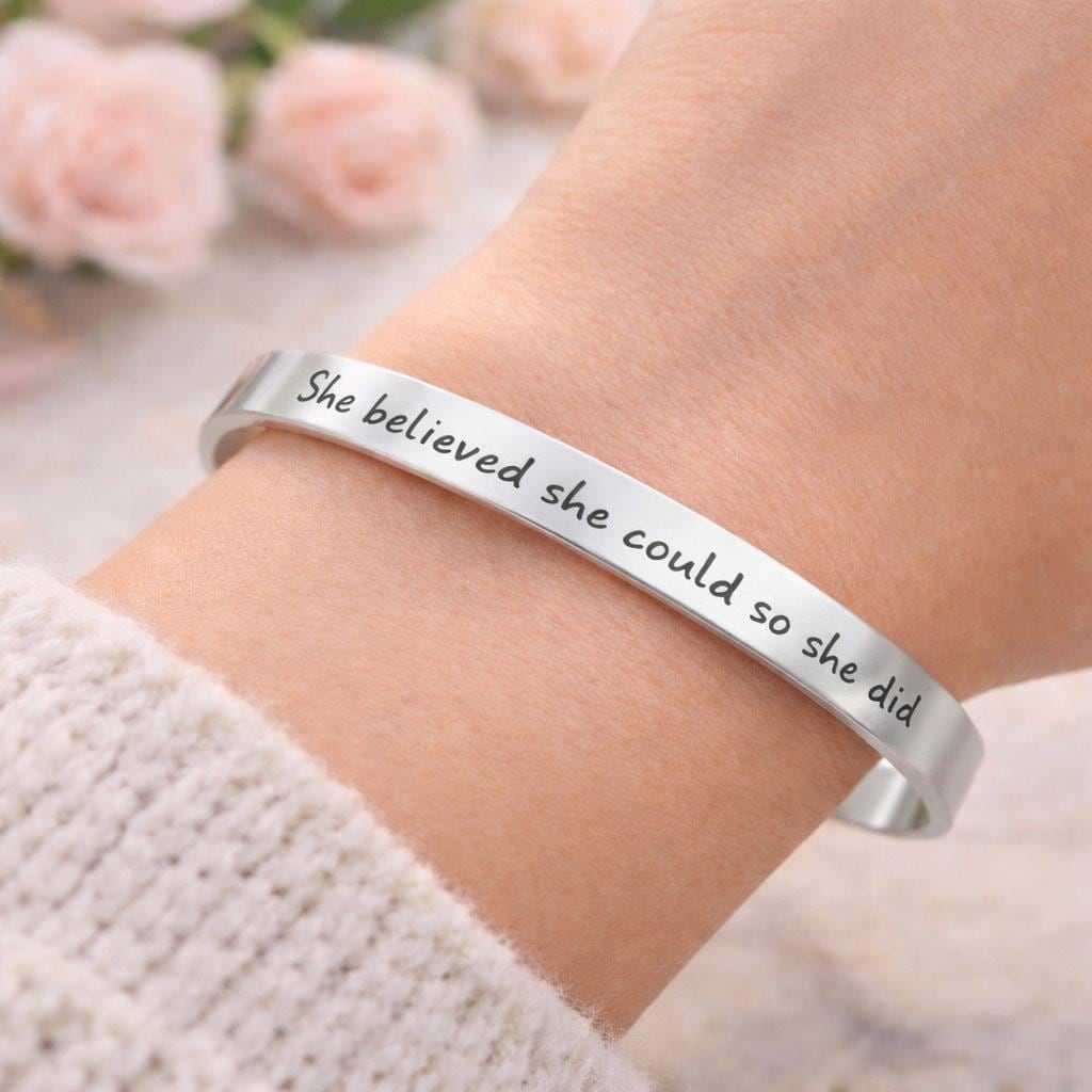 She believed she could so she did STRENGTH Bracelet dainty Cuff stacking Bangle Mantra Quote Bracelets for Girls & Women.
