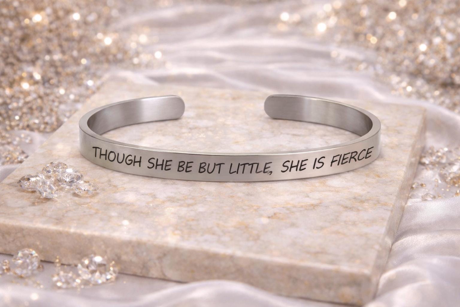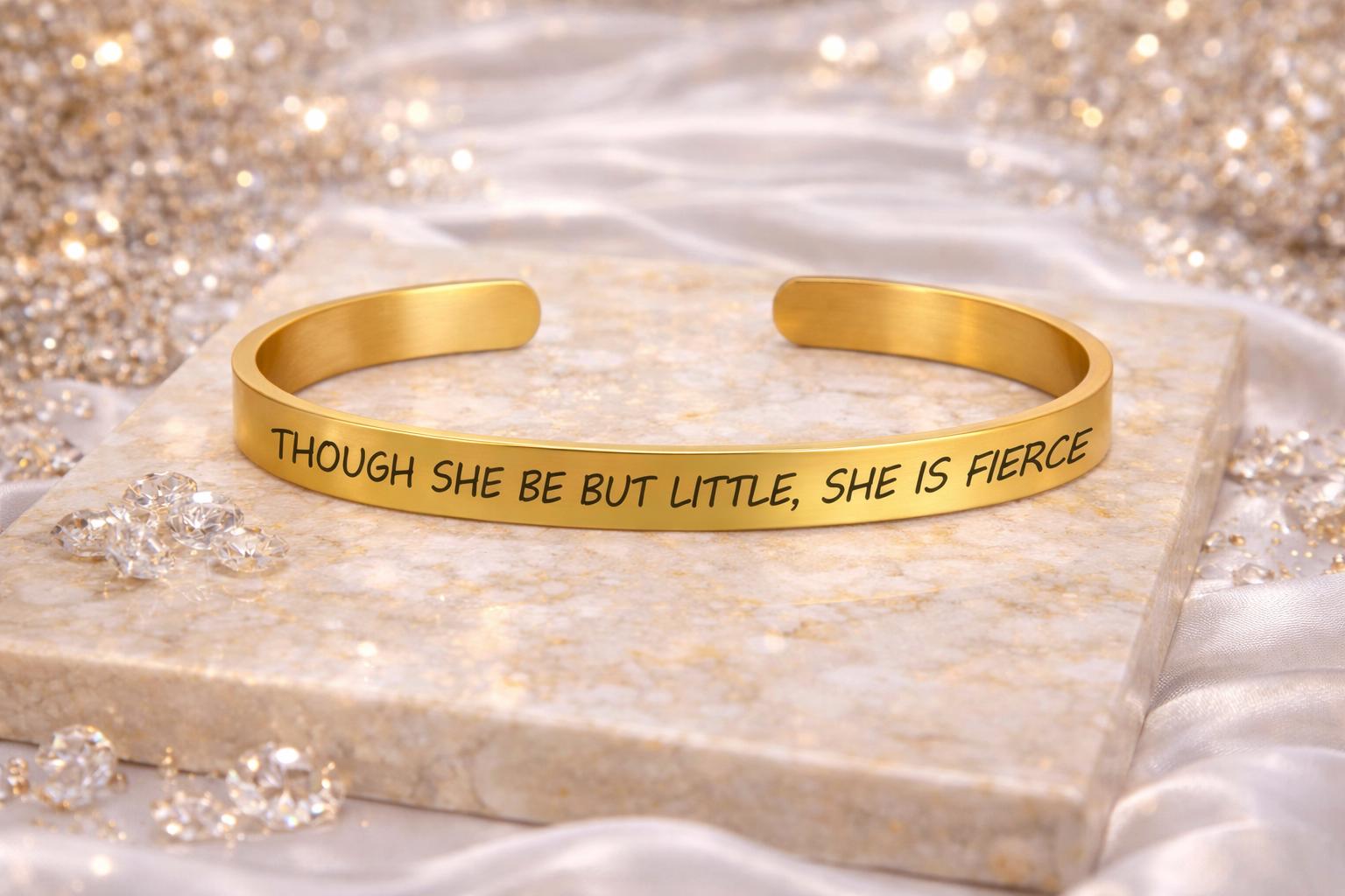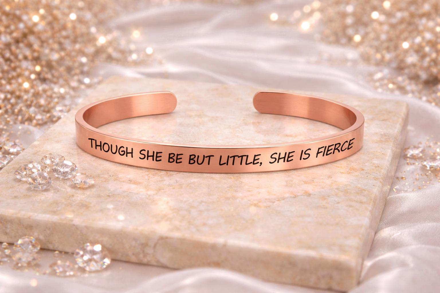 Though she be but little she is fierce personalized cuff Bracelet is available in 2 Color tones. Rose Gold color & Steel color. Make your choice or buy both.