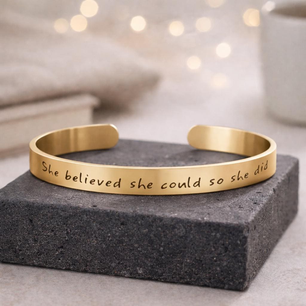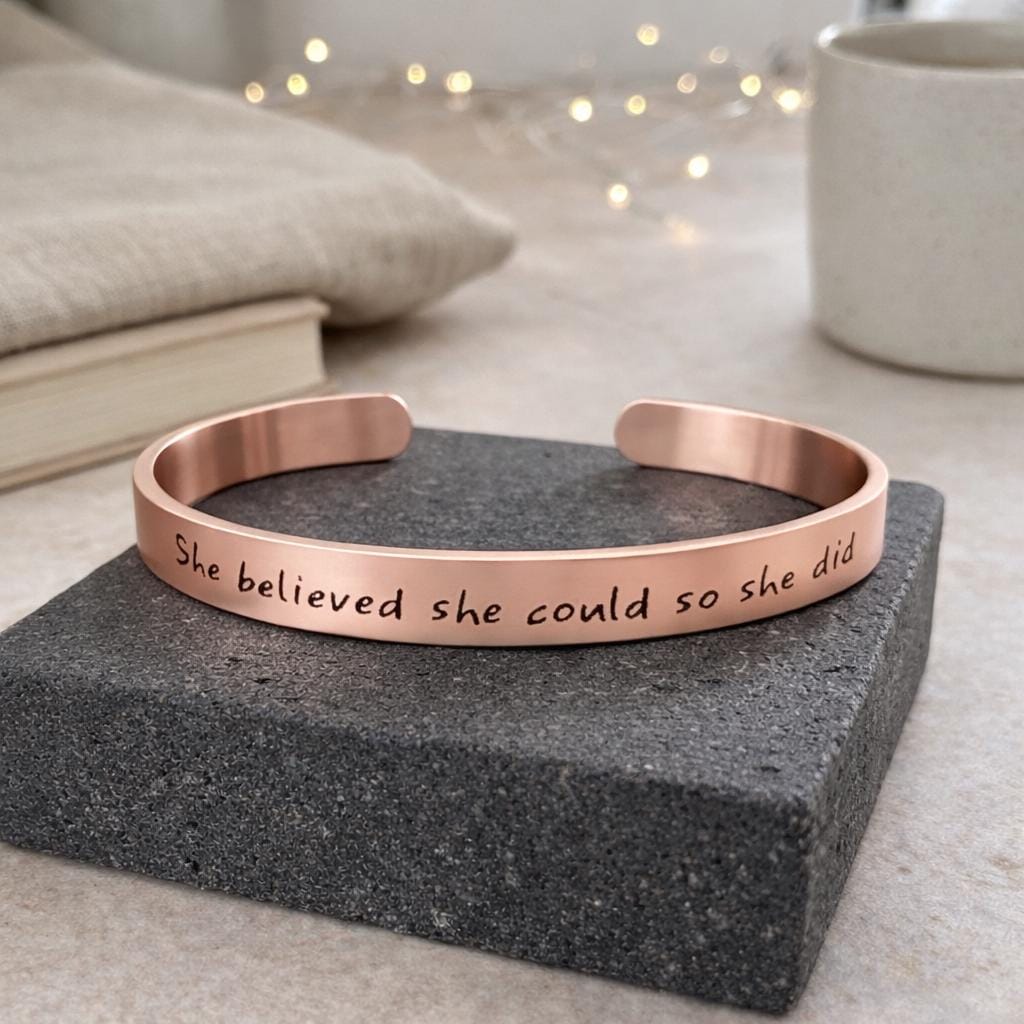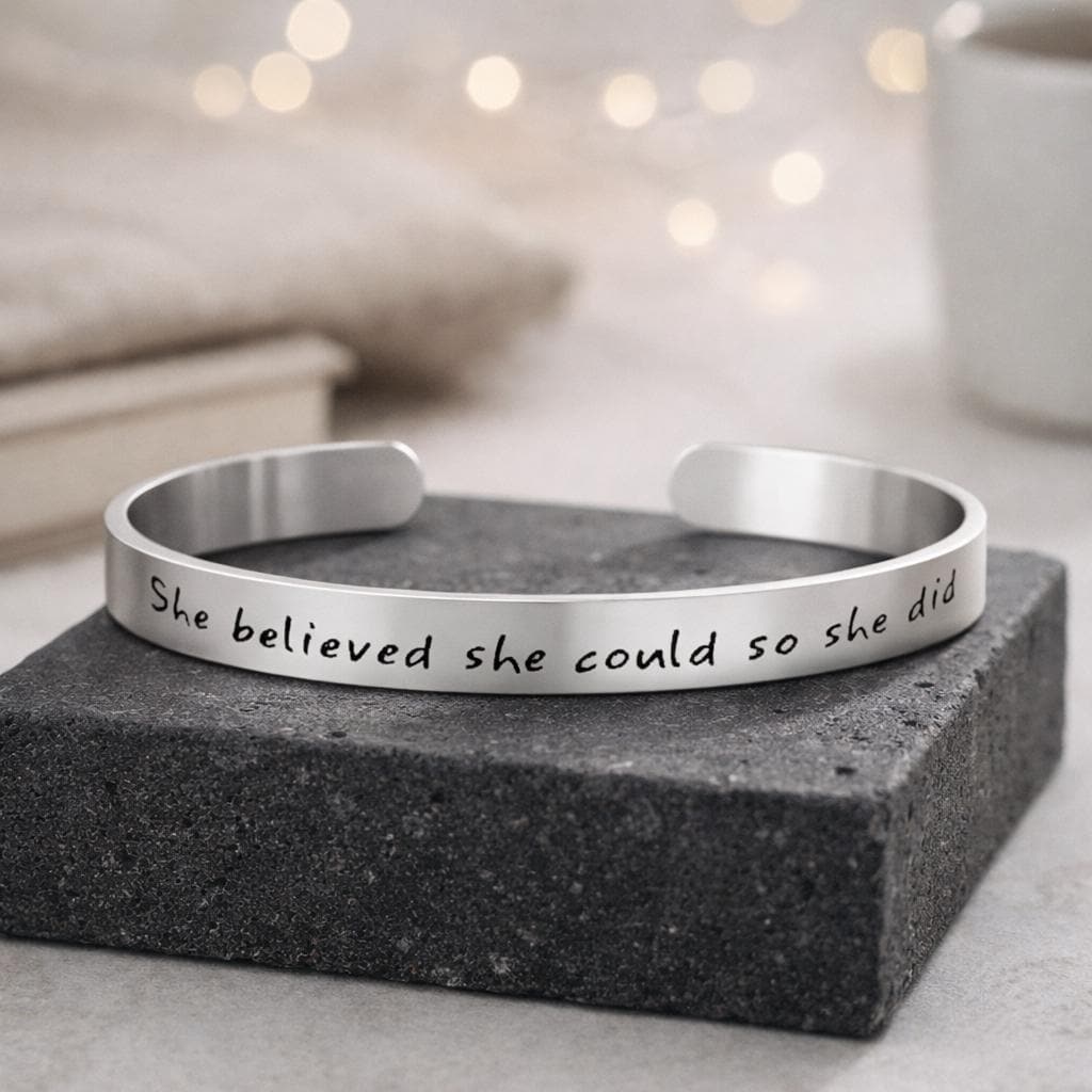 She believed she could so she did STRENGTH Bracelet dainty Cuff stacking Bangle Mantra Quote Bracelets for Girls & Women.
