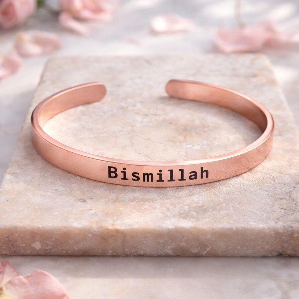 Expertly crafted and elegantly engraved, this minimalist cuff is designed for both men and women. Whether you are looking for a meaningful Ramadan gift or a spiritual accessory for yourself, this "Bismillah" (In the Name of Allah) bracelet is a timeless piece that complements any style.