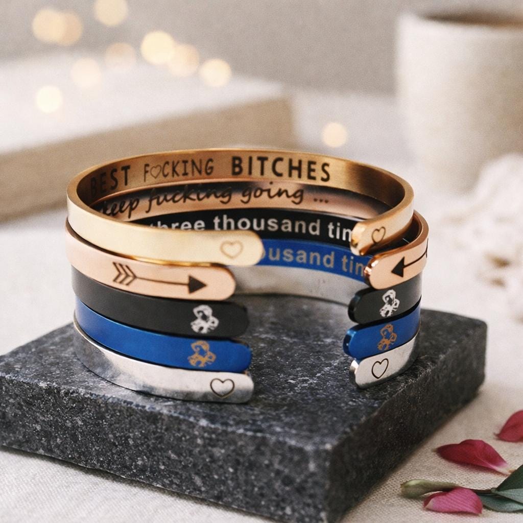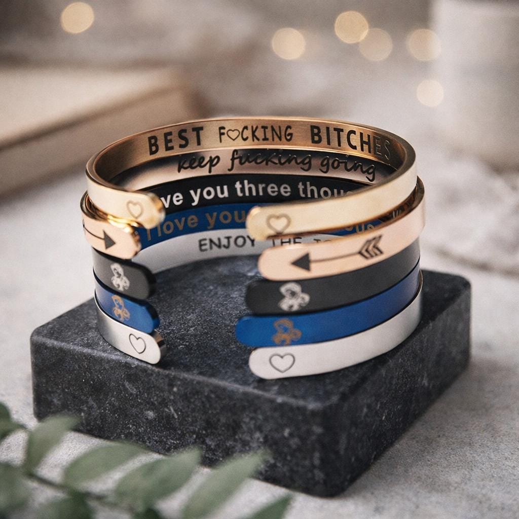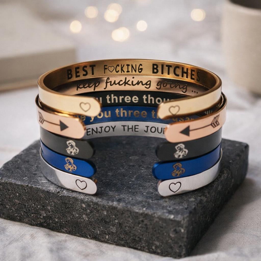 Personalize, and express your unique feelings on this Cuff Bracelet. Include your thoughts on this unique bracelet such as names, religious verses, GPS Coordinates, famous quotes, monograms and initials, memorable dates (birthdays or anniversary), memorable places, and zodiacs on this bracelet.