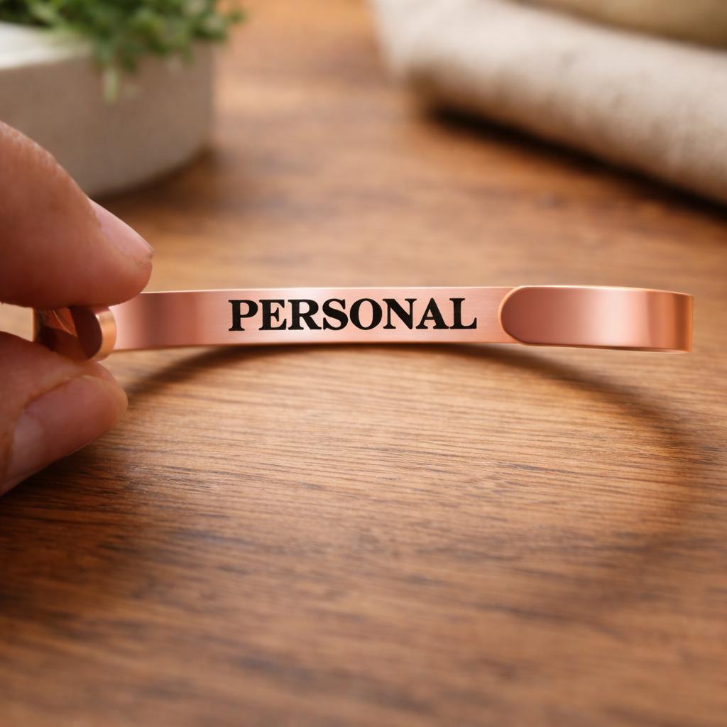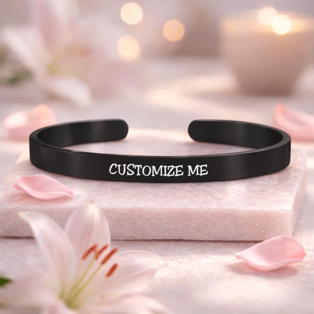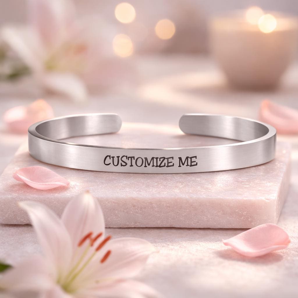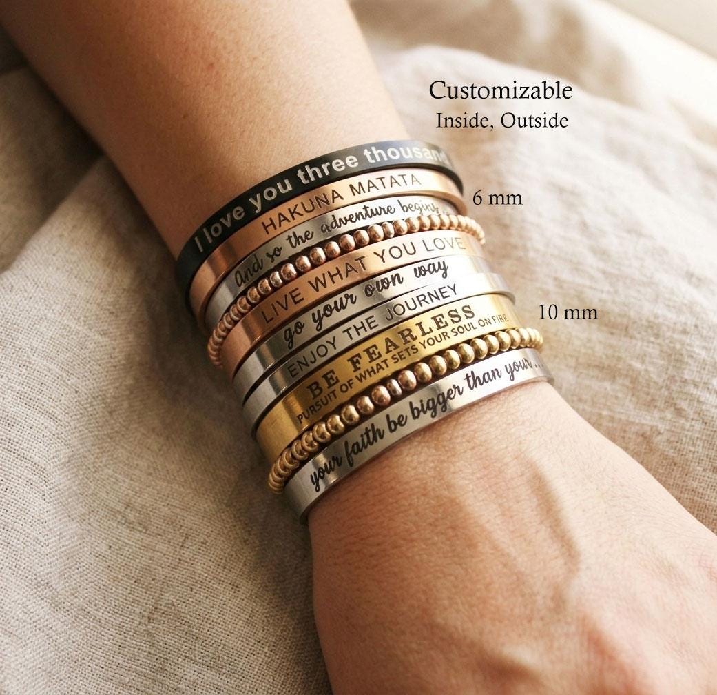 Personalize, and express your unique feelings on this Cuff Bracelet. Include your thoughts on this unique bracelet such as names, religious verses, GPS Coordinates, famous quotes, monograms and initials, memorable dates (birthdays or anniversary), memorable places, and zodiacs on this bracelet.