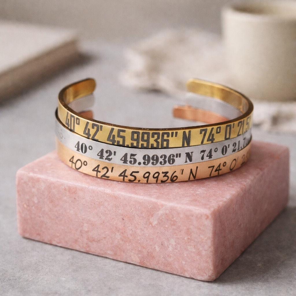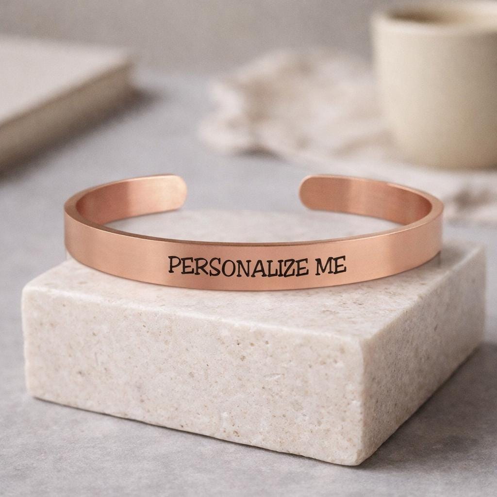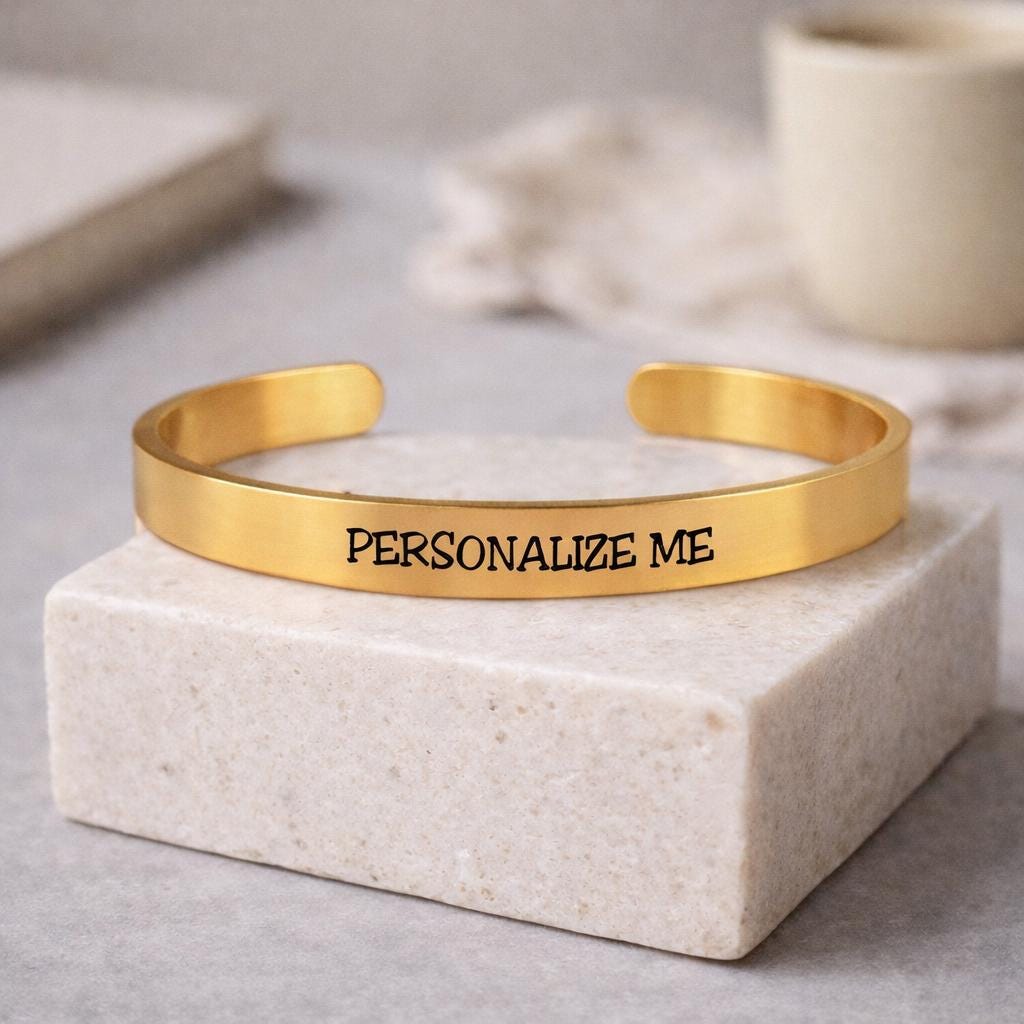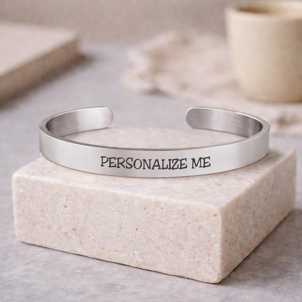Personalize, and express your unique feelings on this Cuff Bracelet. Include your thoughts on this unique bracelet such as names, religious verses, GPS Coordinates, famous quotes, monograms and initials, memorable dates (birthdays or anniversary), memorable places, and zodiacs on this bracelet.