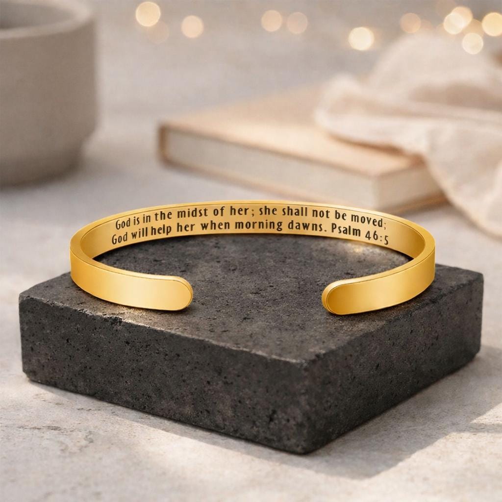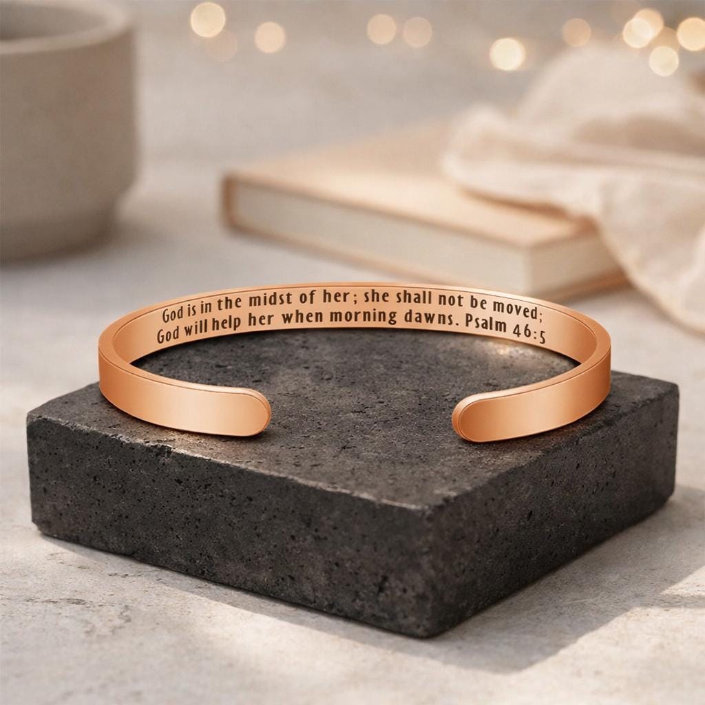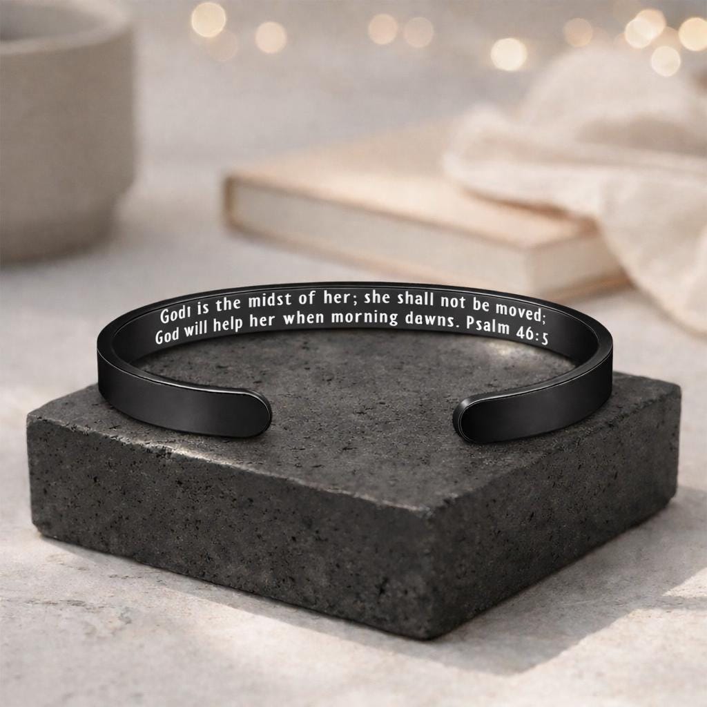 God is in the midst of her; she shall not be moved; God will help her when morning dawns. Psalm 46:5 Daily Reminder Engraved Bracelet