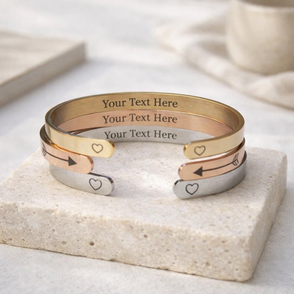 Personalize, and express your unique feelings on this Cuff Bracelet. Include your thoughts on this unique bracelet such as names, religious verses, GPS Coordinates, famous quotes, monograms and initials, memorable dates (birthdays or anniversary), memorable places, and zodiacs on this bracelet.